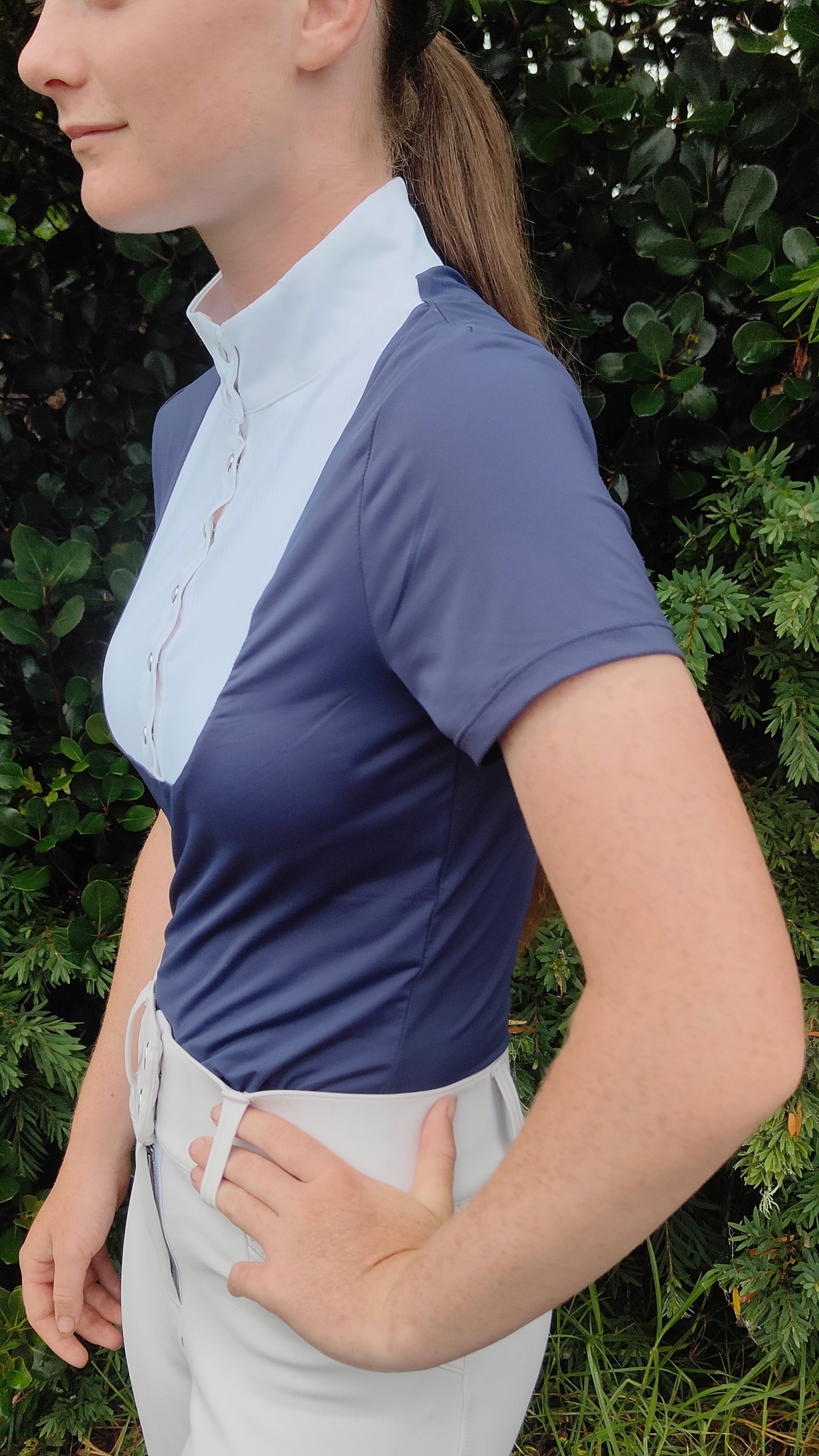 Our Navy Blue Show Shirt comes with a white colour and bib. Designed so you can wear with or without a stock. These are in short sleeve only and look smart when worn with a jacket or without.